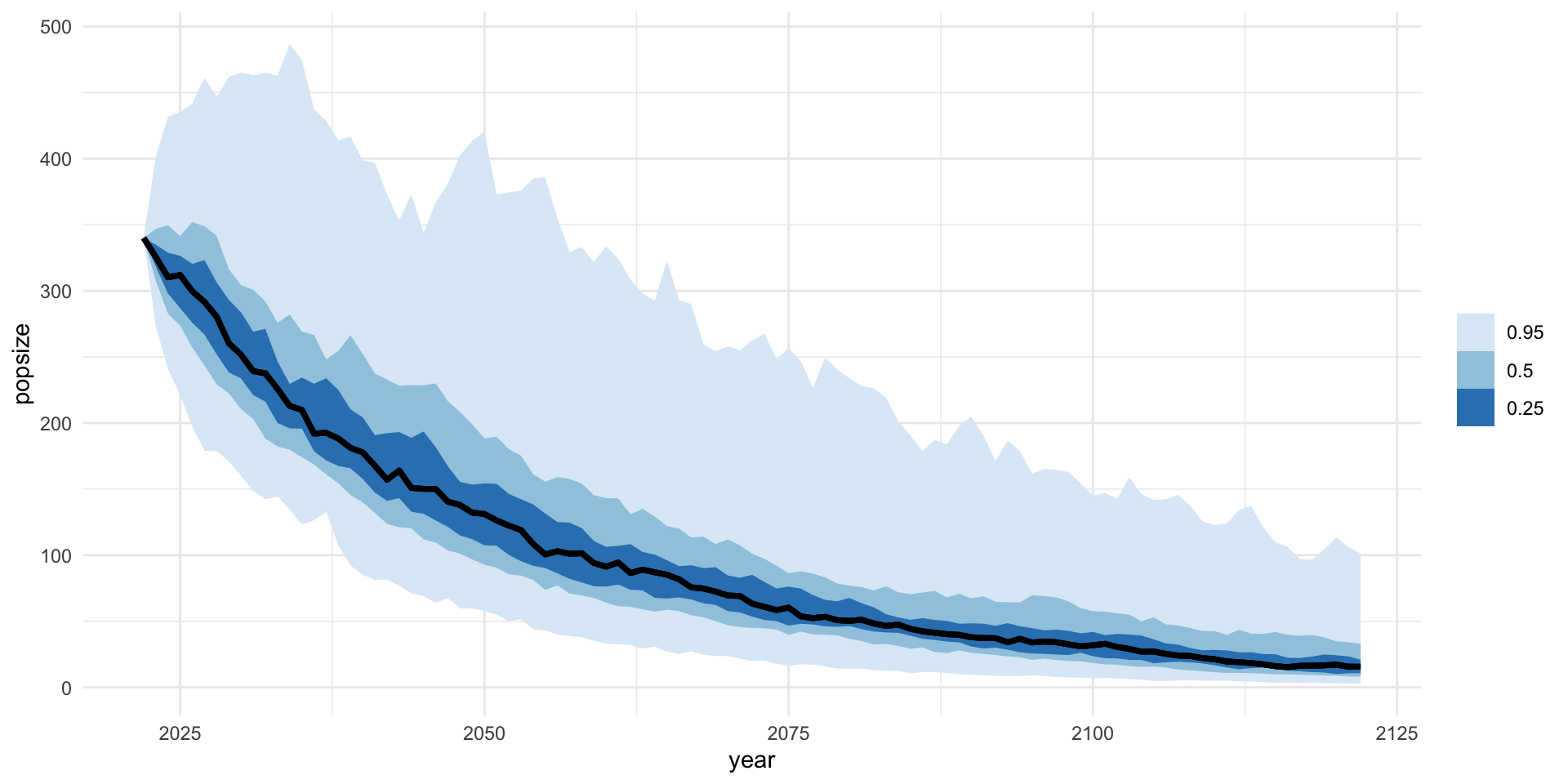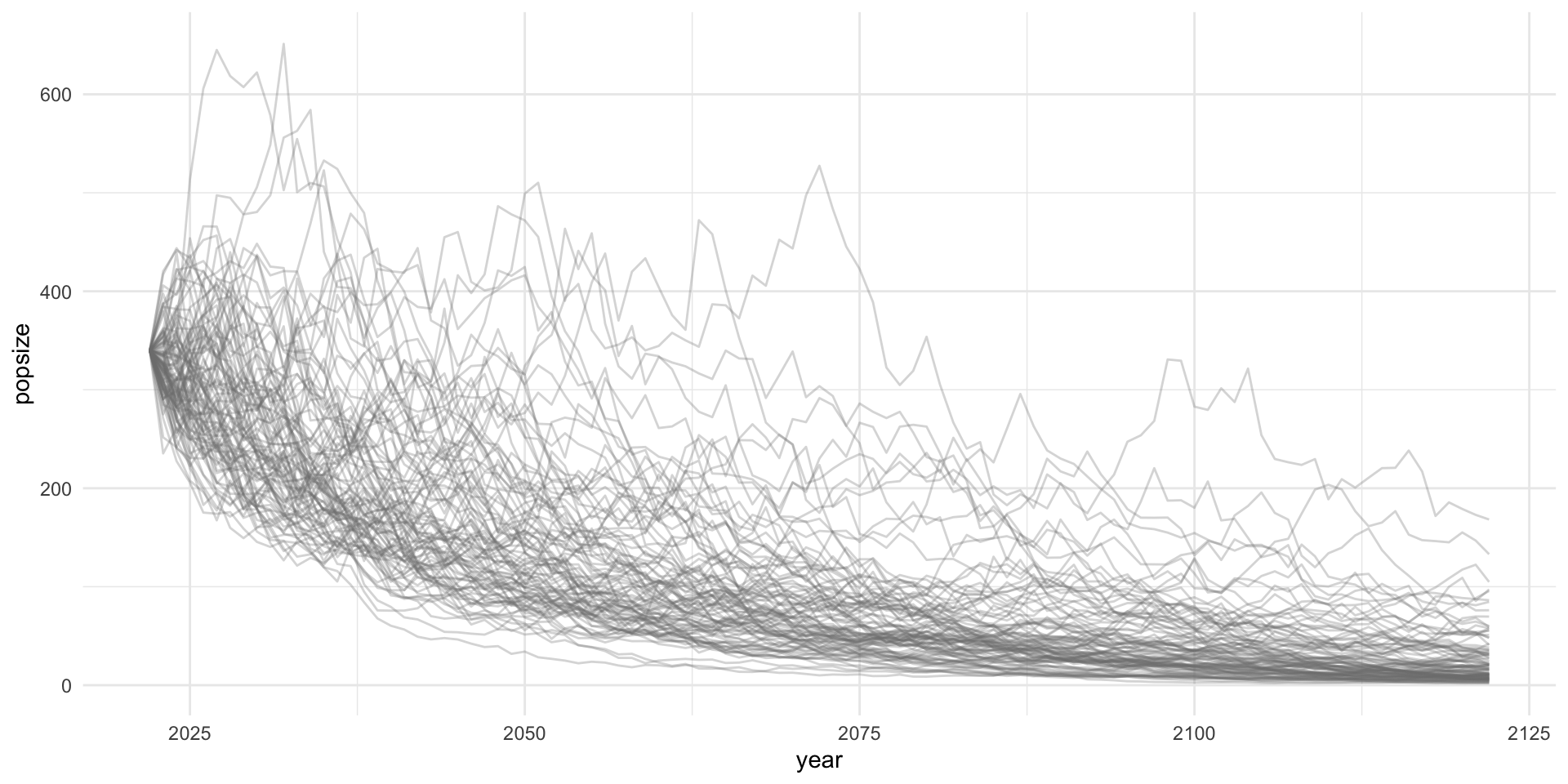 ## [10] "a + b + c + d + e + f + g + h + i + j"Status for endangered species are often based on a risk evaluation of population projections. We want to project population dynamics forward in time given uncertainty in future dynamics. We want to do this lots of times to quantify the risk of extinction.